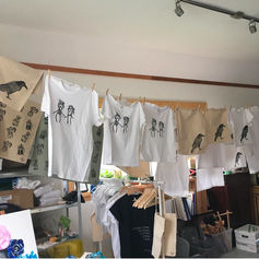 When I first got into printmaking I started printing on baby onesies as many of my friends were having children and it made for great unique gifts. This quickly evolved to me going to markets to sell my hand-printed wares. I printed on adult t-shirts, onesies, teatowels, napkins, and totebags. Then I got into sewing my own products, like pillows and zipper pouches, and creating custom baby quilts. This all happened pre-covid and after covid I decided to focus on printmaking for fine art. I still enjoy printing on fabric and sewing from time-to-time, but it's mostly for gifts only. The amount of work it takes to sew and print a single item, it just doesn't make any cents.